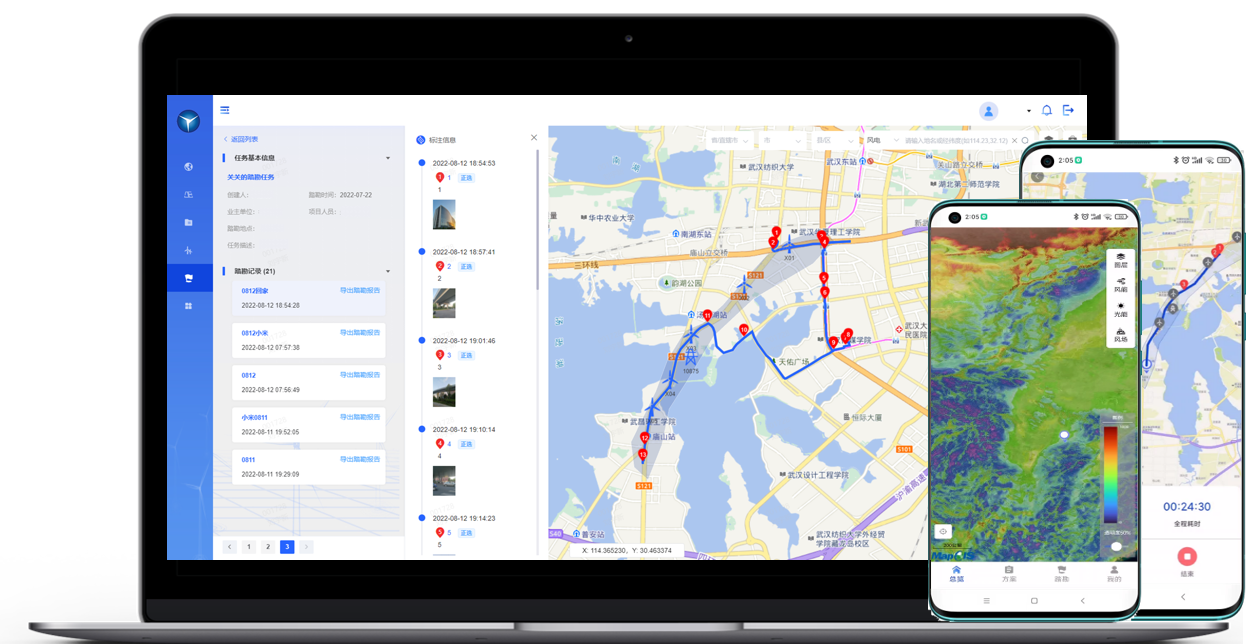 “紙上得來終覺淺,絕知此事要躬行”,對(duì)于已經(jīng)規(guī)劃好的方案,需要進(jìn)行現(xiàn)場(chǎng)實(shí)地踏勘,復(fù)核點(diǎn)位有效性,進(jìn)行更改或者微調(diào)以確保最終建設(shè)方案的可行性。馭風(fēng)移動(dòng)端內(nèi)置離線天地圖(包含衛(wèi)星影像)、資源圖譜、項(xiàng)目方案資料,可根據(jù)初步方案逐個(gè)點(diǎn)位進(jìn)行考察,利用GPS定位、地理信息查詢、風(fēng)參數(shù)查詢、踏勘軌跡記錄、圖文影像標(biāo)注等功能記錄每個(gè)點(diǎn)位周邊的環(huán)境情況、建設(shè)條件、道路條件等情況,為后續(xù)施工建設(shè)做信息儲(chǔ)備。在全場(chǎng)踏勘結(jié)束后會(huì)自動(dòng)生成踏勘報(bào)告并將踏勘任務(wù)同步至Web端,實(shí)現(xiàn)雙端聯(lián)動(dòng),用戶可以在任意設(shè)備靈活查看、分享記錄。